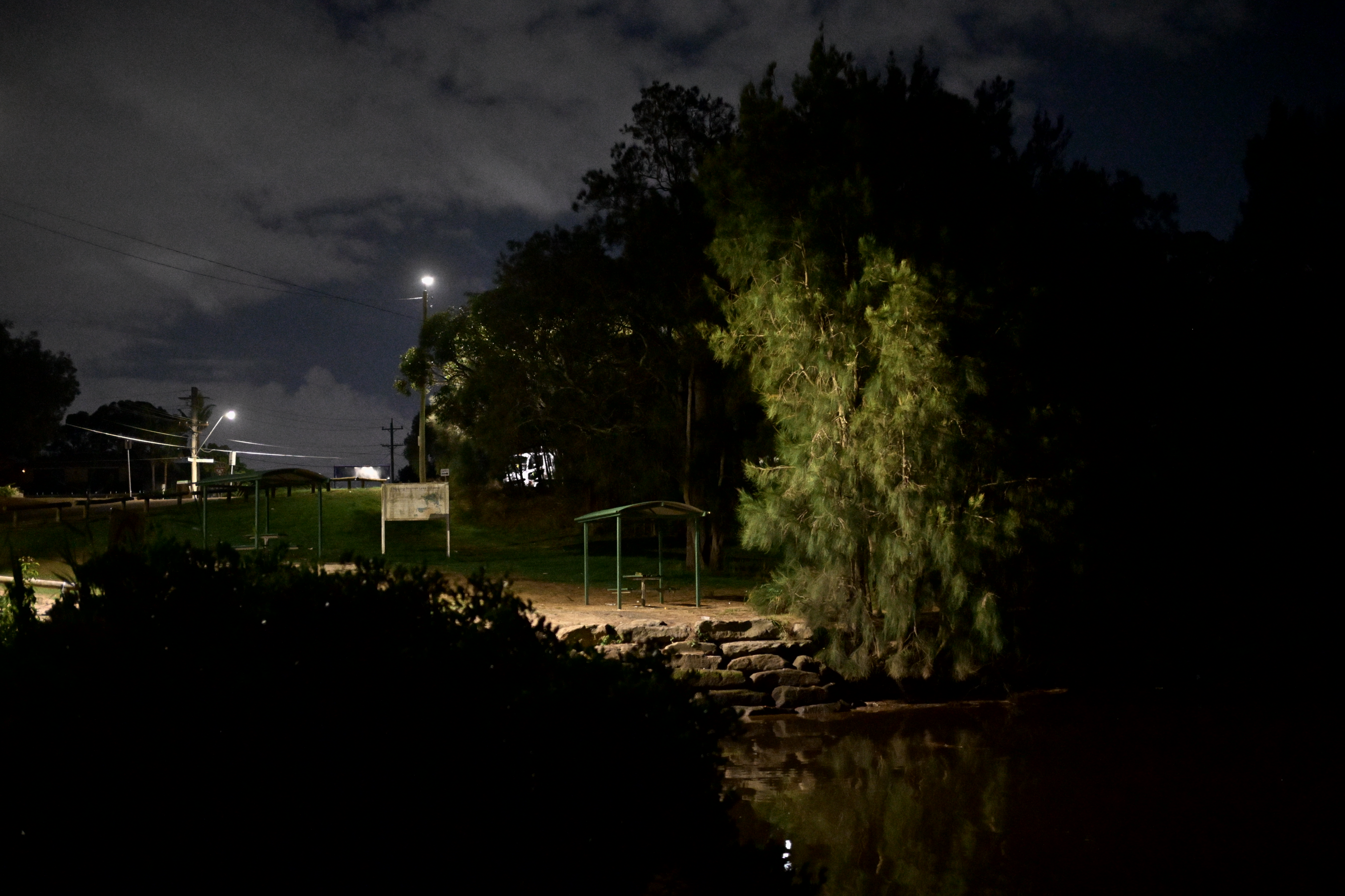 im alone under a streetlight in a park near midnight